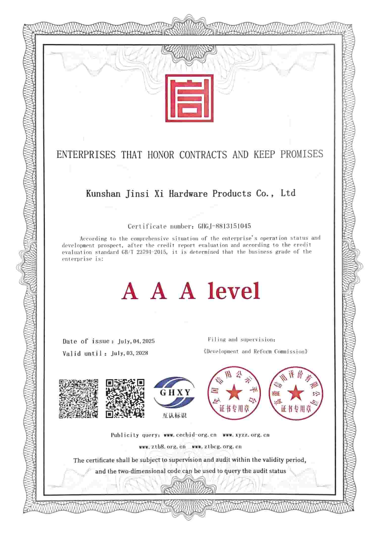 쿤산진식시(주)메탈웨어는 "계약을 준수하고 약속을 지키는 AAA급 기업"이라는 칭호를 공식적으로 획득했습니다. JINSIXI는 항상 "단결과 협력, 근면, 우수성과 완벽성 추구"라는 경영 철학을 고수해 왔으며, 정직하게 운영하고 고객에게 고품질 서비스를 제공하며 궁극적으로 "완벽한 성취"를 달성해 왔습니다.